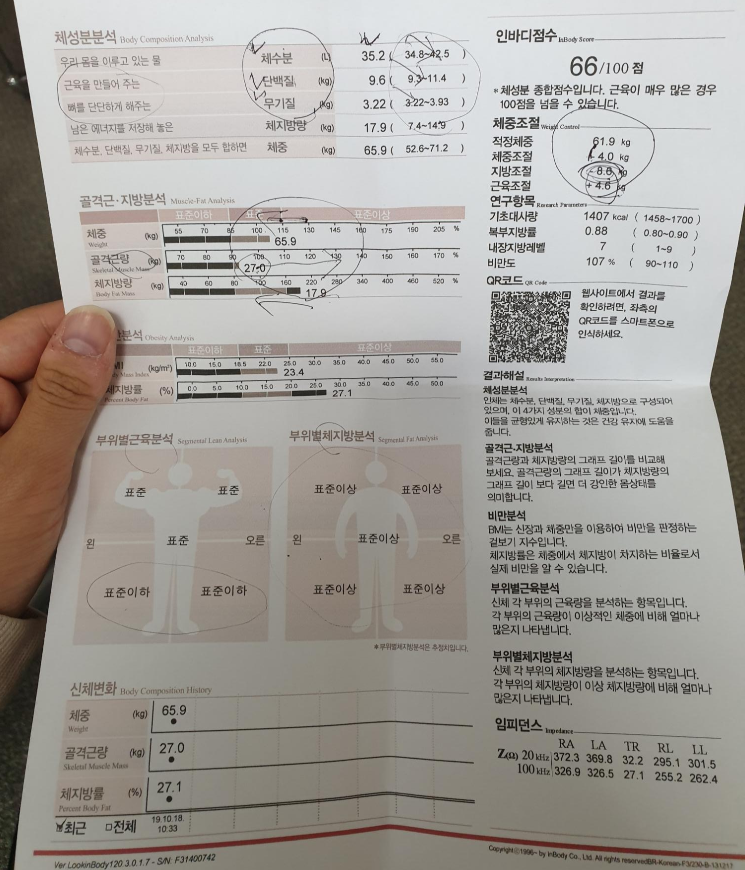 위 사진은 작년 10월 18일 종합건강검진 때 측정했던 인바디 결과, 아래 사진은 올해 1월 23일에 측정한 인바디 결과이다.
