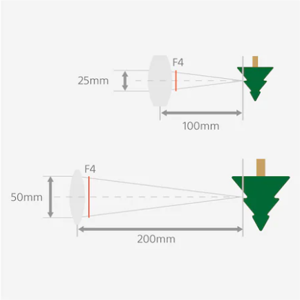 F4.0 25mm 렌즈가 훨씬 직경이 짧다는것을 알 수 있습니다. 위의 스펙으로 실제 렌즈가 만들어진다면 렌즈 크기가 훨씬 작을겁니다.