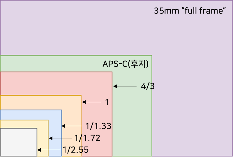 | Type | 1/2.55 인치 | 1/1.72 인치 | 1/1.33 인치 | 1인치 | Four Thirds | APS-C (크롭바디) |